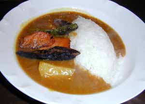 | 同伴した友人が、欧風カレー(野菜)を食べたので、味見させてもらう。「欧風カレー」すなわち、ルーカレーにしては、かなり辛い。スパイスもかなりはいっていて、刺激的。甘味よりも、辛味のほうが主役になっているルーカレーで、ちょっと珍しい。ただ、ルーカレーとしては、甘口の方があっているような。 「カレー博物館」でも欧風カレーを食べたが、そちらの方は、スパイスが抑制されていて、タマネギや野菜の甘さが効いていて、おいしかったが、それと比べると何かレベルダウンするような気がする。もっとも個人の好みにもよるが、私はルーカレーは、うまみとあまみが強い方が好きだ。 (2001年12月2日) |